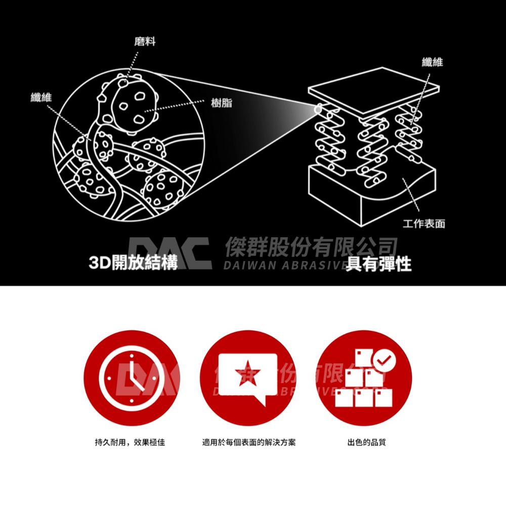 • 多功能與高相容性:其開放式纖維網結構能有效抗負載,避免磨片堵塞。它適用於多種金屬(如鋁、不鏽鋼、碳鋼等),並可應用於除毛邊、清潔、拋光、修整等各種工序。