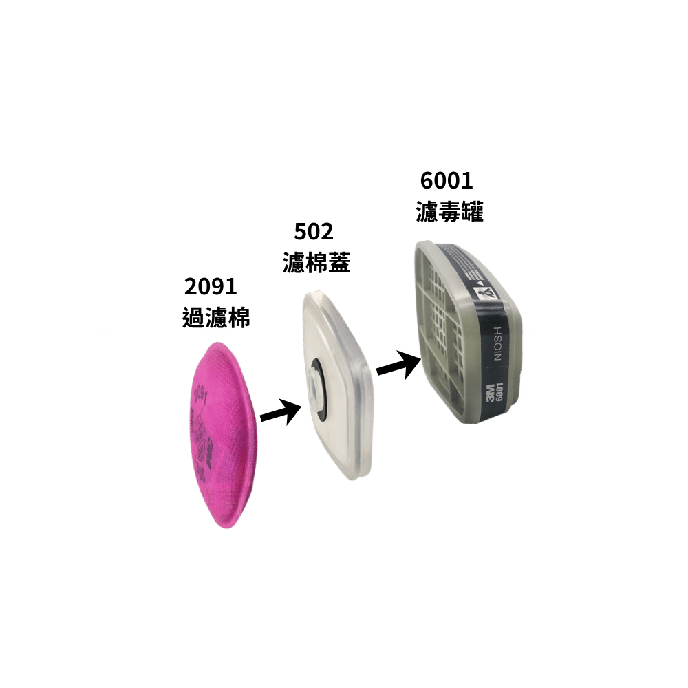 • 透過3M 502濾蓋6000系列濾毒罐(6001、6002、6003、6004、6005、6006)3M 2000系列濾棉(2091、2096、2097、2291、2296、2297)結合,達到最高等級的顆粒物粉塵化學氣體的過濾效力