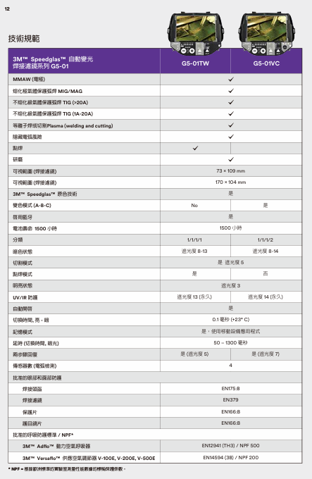 3M G5-01 搭配 VC 與 TW 液晶面板(ADF)規格比較表